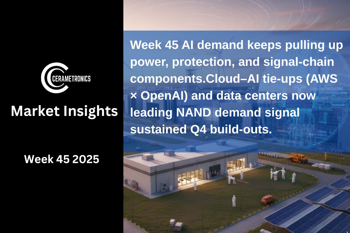 AI demand keeps pulling up power, protection, and signal-chain components. Cloud–AI tie-ups (AWS × OpenAI) and data centers now leading NAND demand signal sustained Q4 build-outs. Watch for tightening in automotive-grade discretes/ESD (visible in price spikes) and opportunistic buys in logic translators, muxes, and buck PMICs that just surged in demand but haven’t fully repriced.